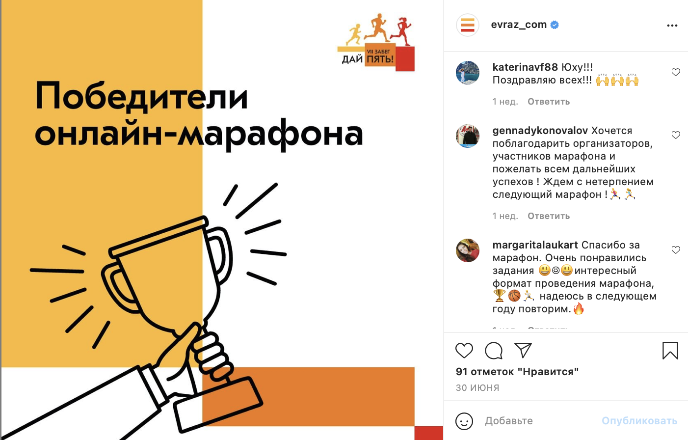 Активация повлияла на сообщества «Евраза» количественно и качественно. Нам удалось передать атмосферу праздника. 42 дня подписчики не стеснялись делиться своими результатами, давали советы, устраивали дискуссии, просто знакомились и болтали друг с другом, попутно набирая очки. Геймификация стала органичным продолжением забега «Дай пять!».