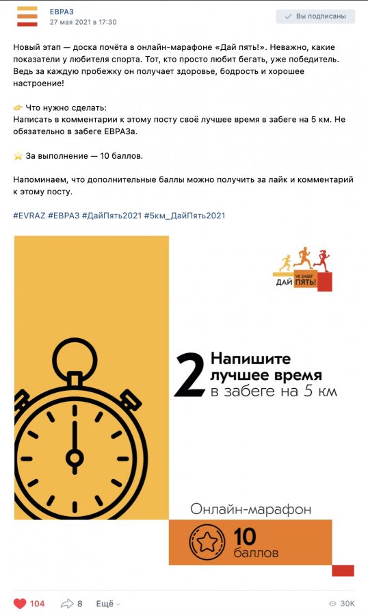Больше всего очков приносило выполнение задач из поста. Например, поделиться селфи с тренировки, личным рекордом в беге на пять километров или смонтировать видео с лайфхаком для пробежки. Но баллы приносили не только достижения в заданиях. Каждое действие в постах онлайн-марафона приносило очки, будь то лайк, комментарий, репост или участие в голосовании.