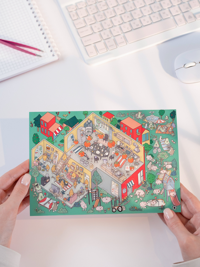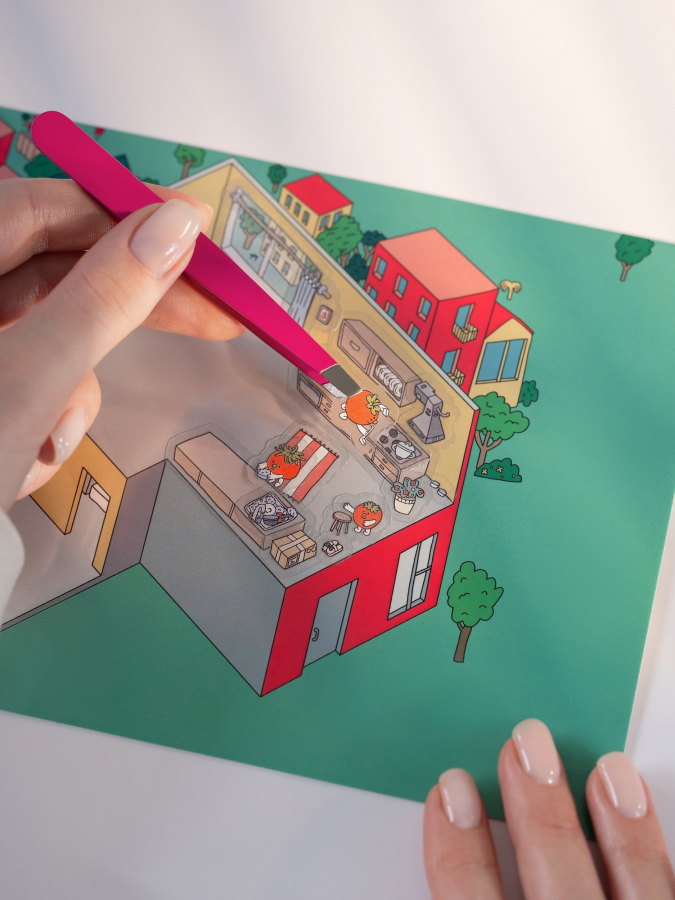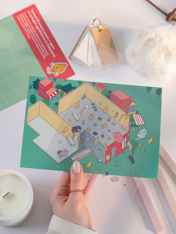 Онлайн-ретейлер «Самокат» представил румбокс — миниатюрную модель пространства, которую можно наполнить стикерами по своему вкусу. Румбокс делится на четыре зоны с персонажами: помидоркой, круассаном, авокадо и зефиркой. Стикеры изображают товары, доступные в «Самокате» — от диффузора до термокружки.
