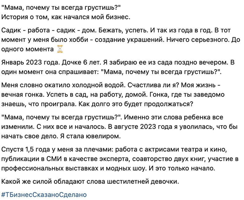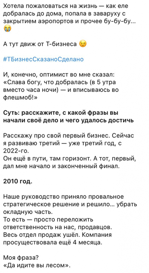 Кажется, бизнес начинается с плана и капитала. Но чаще — с простой фразы: «А что, если…». Именно такие моменты запускают предпринимательские истории. В честь Дня предпринимательства «Т-Бизнес Комьюнити» запустил флешмоб #ТБизнесСказаноСделано. За первую неделю собрано более 1000 историй от фразы «Да идите вы лесом» до вопроса дочери: «Мама, почему ты грустишь?».