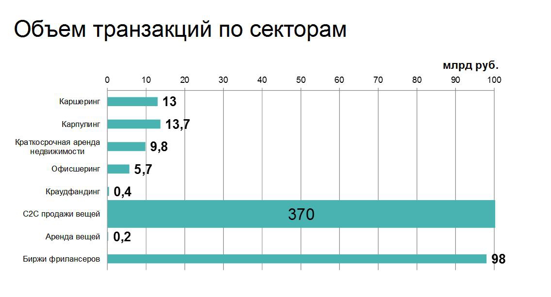 Основной вклад в этот объем внесут: продажи вещей (72% шеринг-рынка), онлайн-биржи фрилансеров (19%), сервисы совместных поездок (карпулинг) и каршеринг (совокупно 5%), а также краткосрочная аренда жилья (2%), составив в общей сложности 370 млрд рублей. Объем онлайн-бирж фрилансеров составит 98 млрд рублей: 2,5 млн россиян сегодня подрабатывают, получая заказы через онлайн-платформы. Около 400 млн рублей придется на краудфандинг.