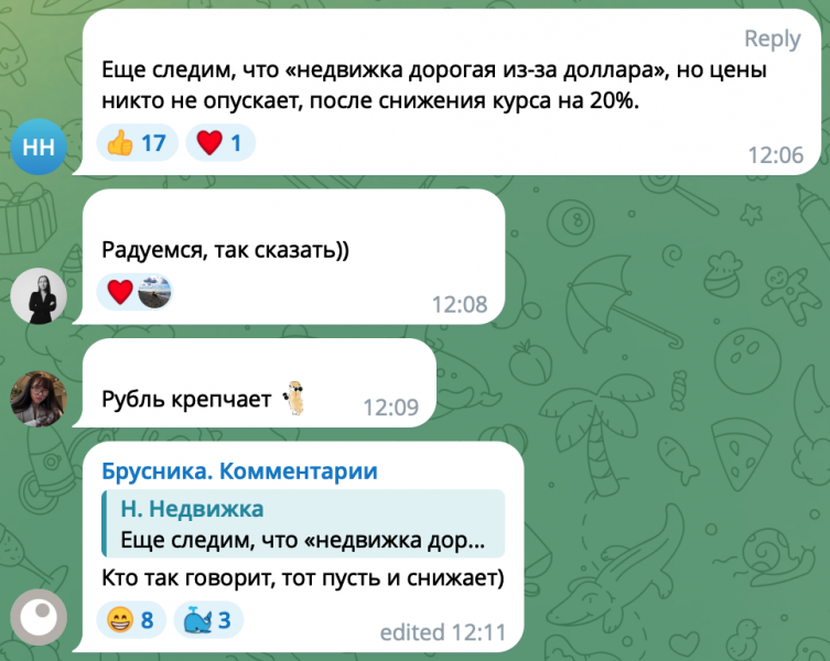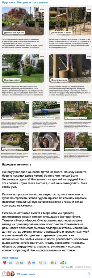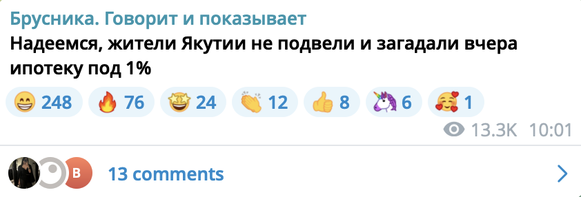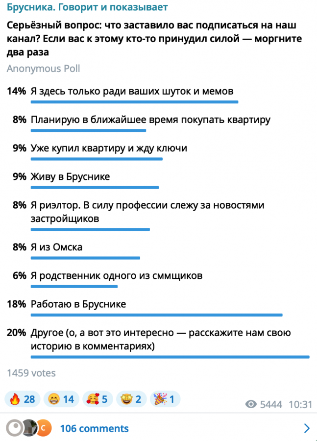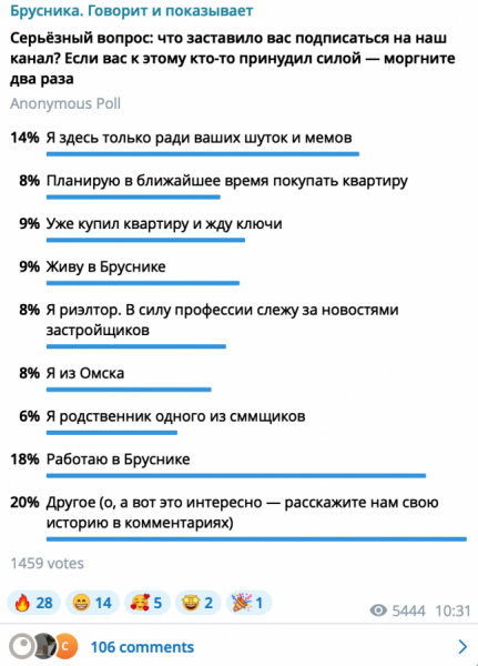 В Telegram-канале «Брусники» значительную долю подписчиков составляют профессиональные участники рынка: архитекторы, маркетологи, застройщики. В общем, те, кто, скорее, не являются клиентами.