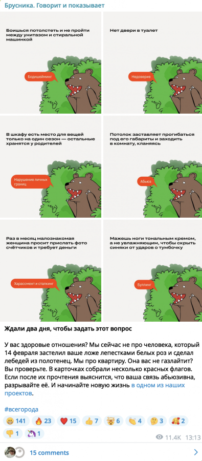 Стиль общения «Брусники» — живой, человечный и без штампов. Почему компания ведет Telegram-канал не как аккаунт застройщика, как шутки и дизайн помогают увеличивать лояльность и как удалось нарастить такую вовлеченность, не гонясь за конверсией? Об этом Сергей Ермак, руководитель PR-отдела «Брусники», рассказал сервису аналитики и управления соцсетями