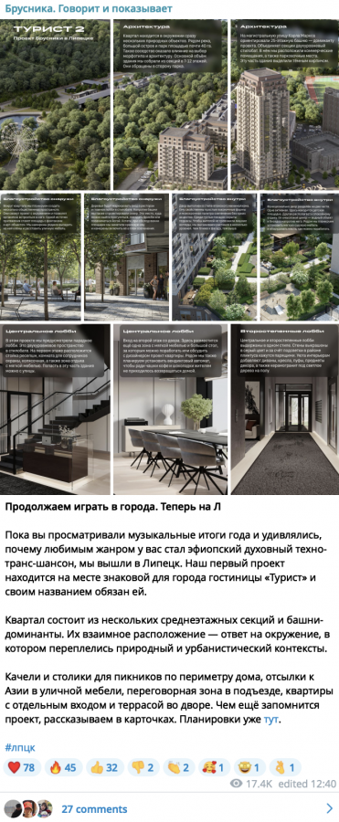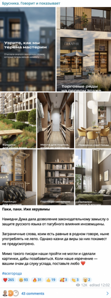 «Брусника» пристально следит за брендами в Telegram, не ограничивая себя сферой строительства, чтобы где-то «позаимствовать идеи» и сделать их лучше.