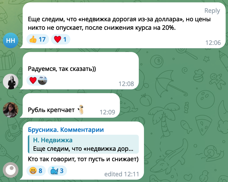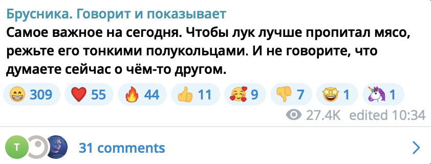 С тех пор позиция «Брусники» не изменилась и Telegram-канал ведется для того, чтобы была вовлеченность, люди переходили на сайт компании и срабатывала высокая конверсия. И это работает, отмечает эксперт: конверсия через Telegram «Брусники» гораздо выше, чем в других рекламных каналах.