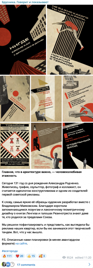 «Брусника» делает карточки на разные тематики: посвященные старту проекта, благоустройству территории или другие. И каждый пост команда старается сделать «чтобы глаз радовался». Один из запоминающихся постов в «Бруснике» подготовили ко дню рождения Александра Родченко: сделали плакаты, насочиняли стихи в стиле Маяковского и сделали аллюзию на их знаменитую рекламу.