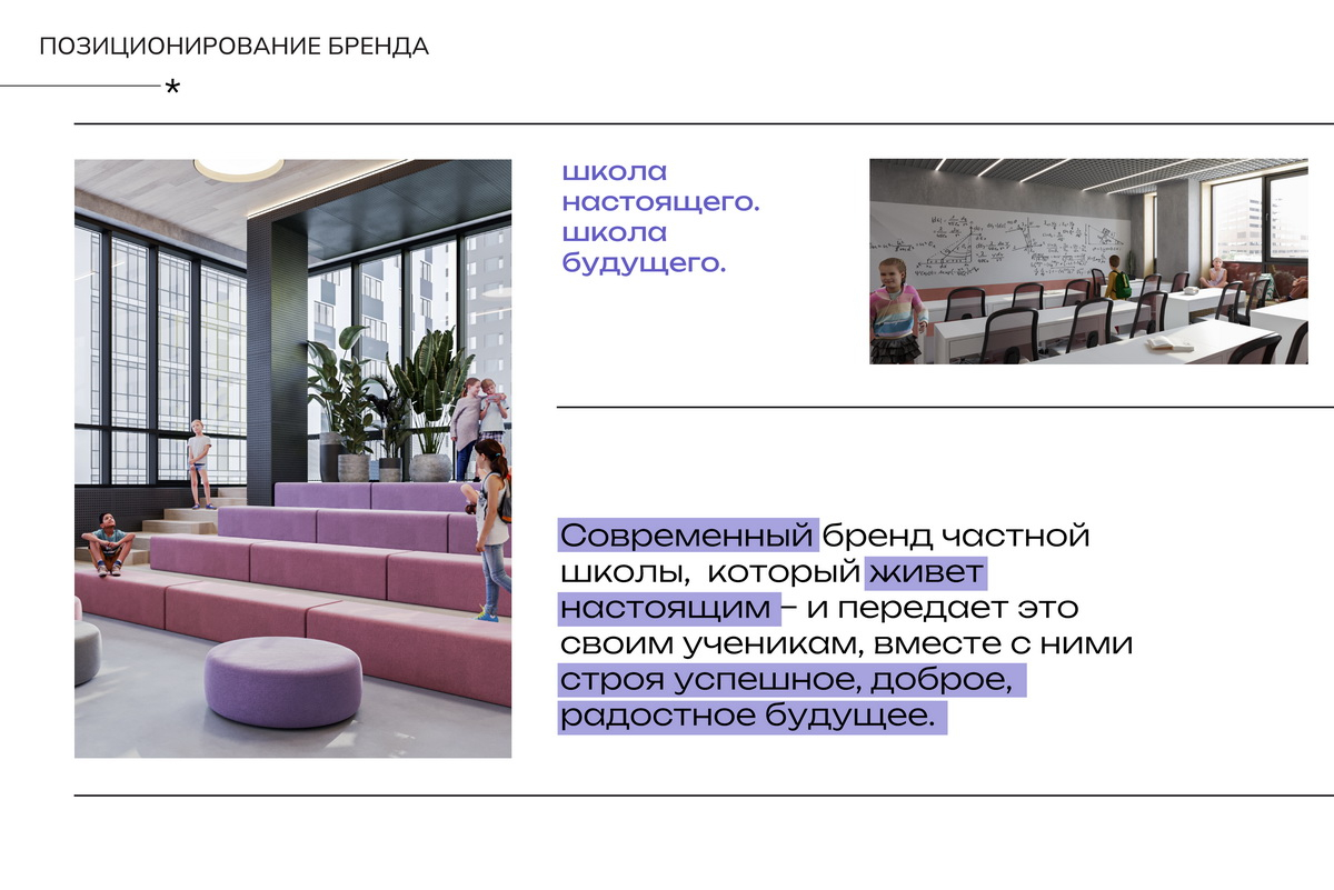 Позиционирование «Школа настоящего. Школа будущего» показывает одновременно и рациональность бренда, который живёт реалиями настоящего времени, проходит его вызовы и использует возможности, и в то же время идеалистичность, вдохновлённость, веру в ценности и лучшее будущее.
