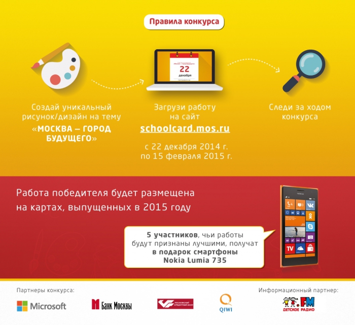 Москвичи смогут проголосовать за лучшую иллюстрацию с 10 по 23 марта 2015 года. Пять финалистов, набравшие наибольшее число голосов, получат в подарок смартфоны Nokia Lumia от партнера конкурса — компании Microsoft.