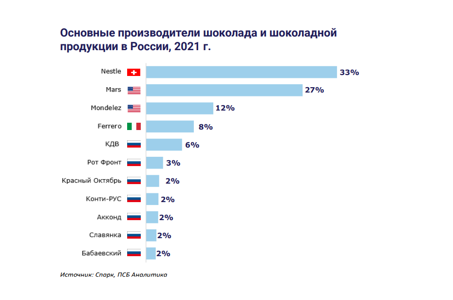 По состоянию на 2021 год, около 81% производства шоколада и шоколадной продукции принадлежали иностранным компаниям, которые имеют собственные производства в России: Nestle — 33% локального рынка, Mars — 27%, Mondelez — 12%.