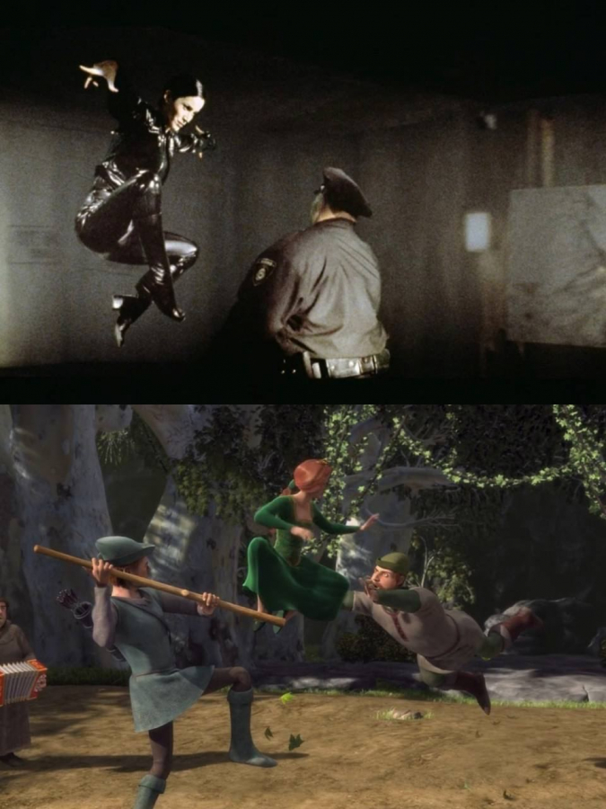 Среди других элементов постмодернизма «Шрек» также содержит отсылки к поп-культуре и иронию: драки в стиле «Матрицы», переосмысление Голливуда как далекого-далекого королевства, и популярных брендов — Burger Prince, Baskin Robbinhood и Furbucks.