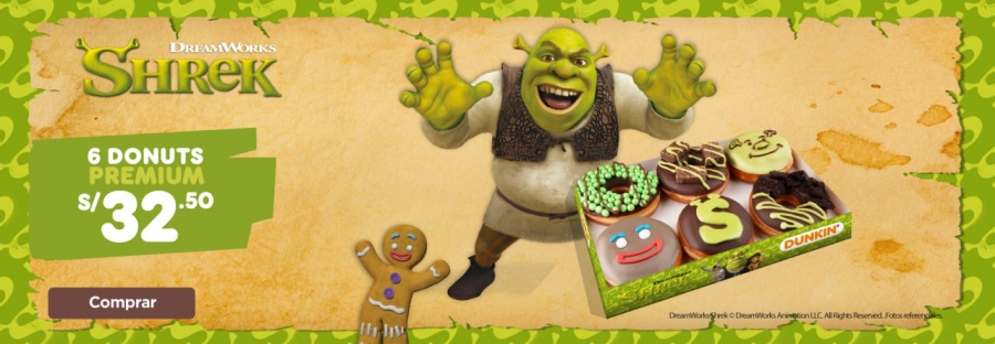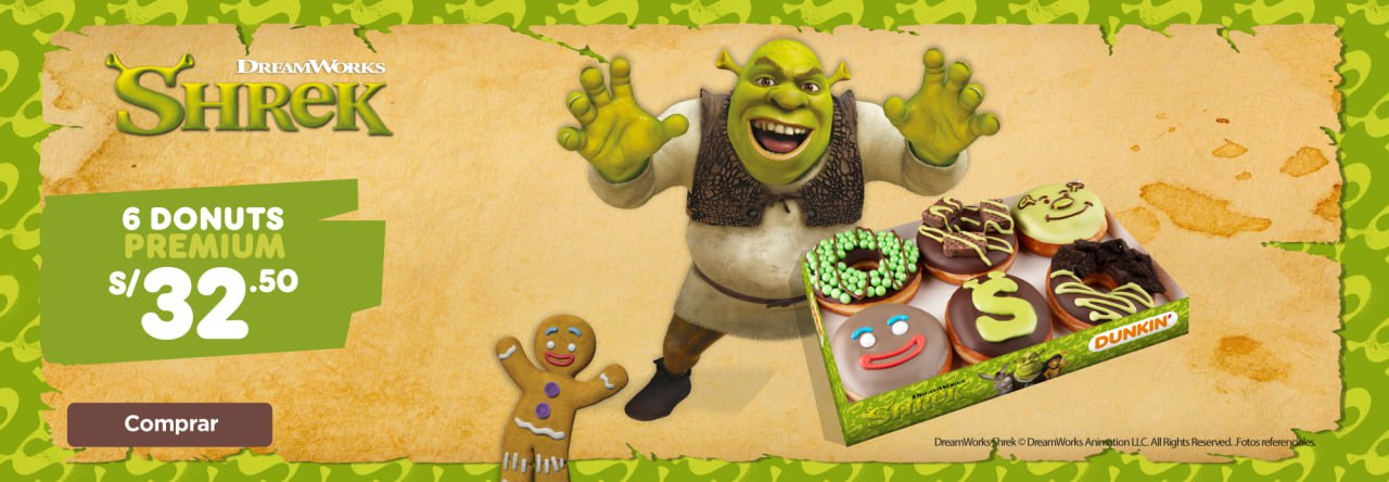 Dunkin' Donuts в Перу запустил серию пончиков в фирменных цветах франшизы — зеленом и коричневом, а также с рожицами Шрека и персонажа Пряника.