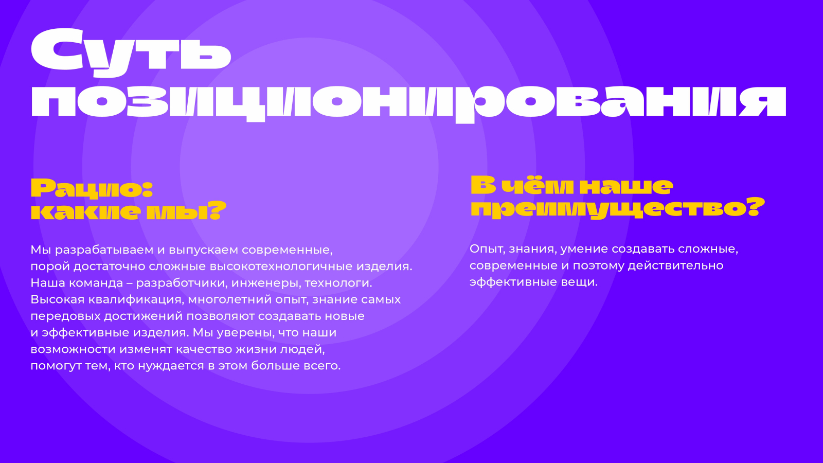 Мы всегда руководствуемся принципом рекламопригодности. Чтобы мы понимали, как будем с клиентом работать дальше на этапе креатива и дизайна. Именно поэтому мы начали с позиционирования компании. Клиент очень интересный, выпускает необычные товары, помогает людям социализироваться. Исключительно положительная история. Но ребятам недоставало позиционирования.