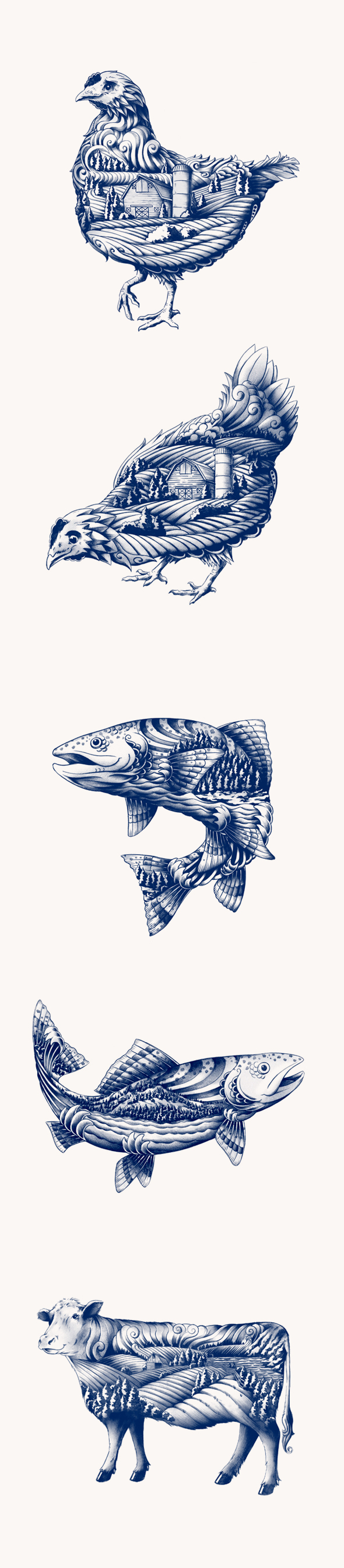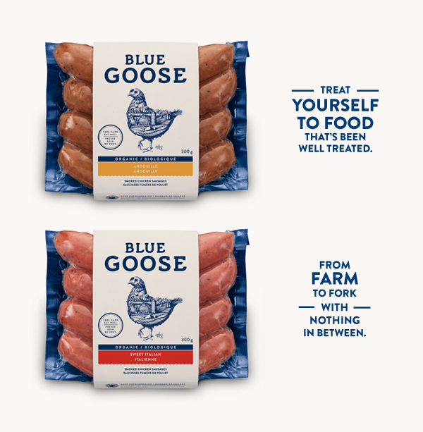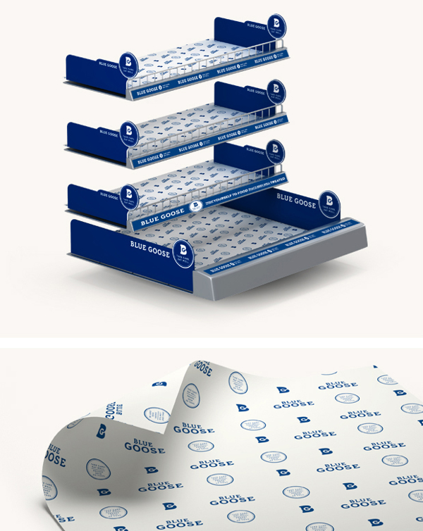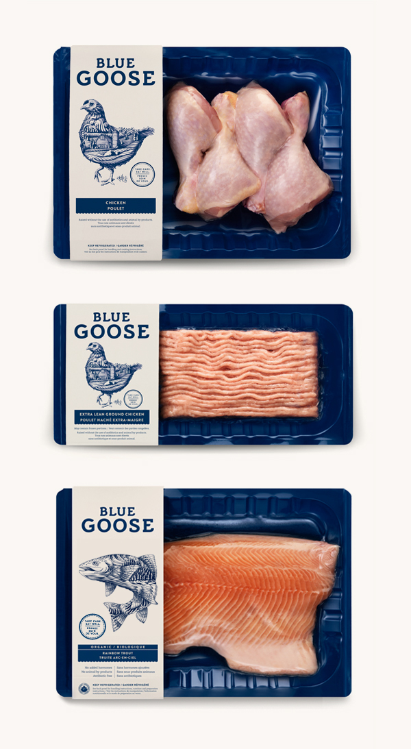 Всемирно известное агентство Sid Lee разработало креативный логотип и дизайн упаковок для канадской компании Blue Goose. На бело-голубых упаковках красуются корова, курица и рыба с деревенскими видами внутри.
