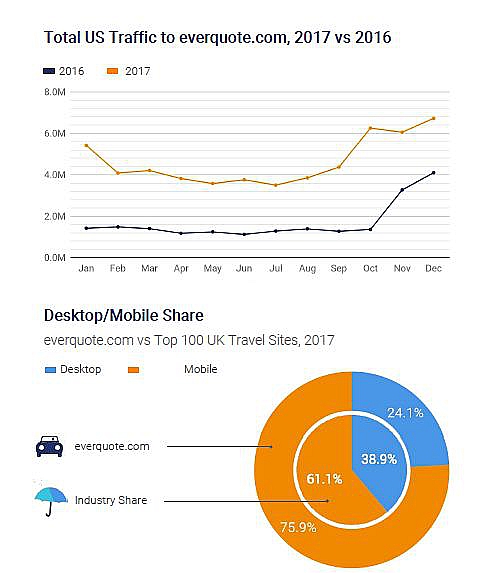 EverQuote.com, чей трафик подскочил на 170%, сделал ставку на медийную рекламу. За год сервис для сравнения тарифов автострахования вдвое увеличил количество источников трафика, при этом реклама таргетировалась на аудиторию 50+. Главная опасность баннеров, даже четко таргетированных — увеличение показателя отказов. Однако стратегия EverQuote сработала, и половина привлеченной аудитории оказалась старше 55 лет. Что и требовалось компании.