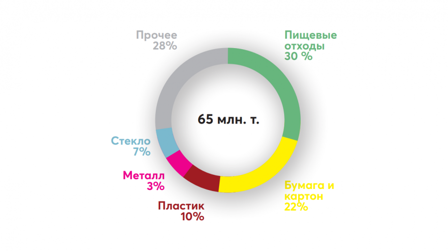 Мы посмотрели, как обстоит ситуация с мусором в России. По данным Минприроды, ежегодно накапливается около 60 млн тонн твёрдых бытовых отходов. Получается, один человек за это время производит около 450 кг мусора. Из доклада Российского экологического оператора следует, что мусорная корзина среднего российского потребителя наполняется так: