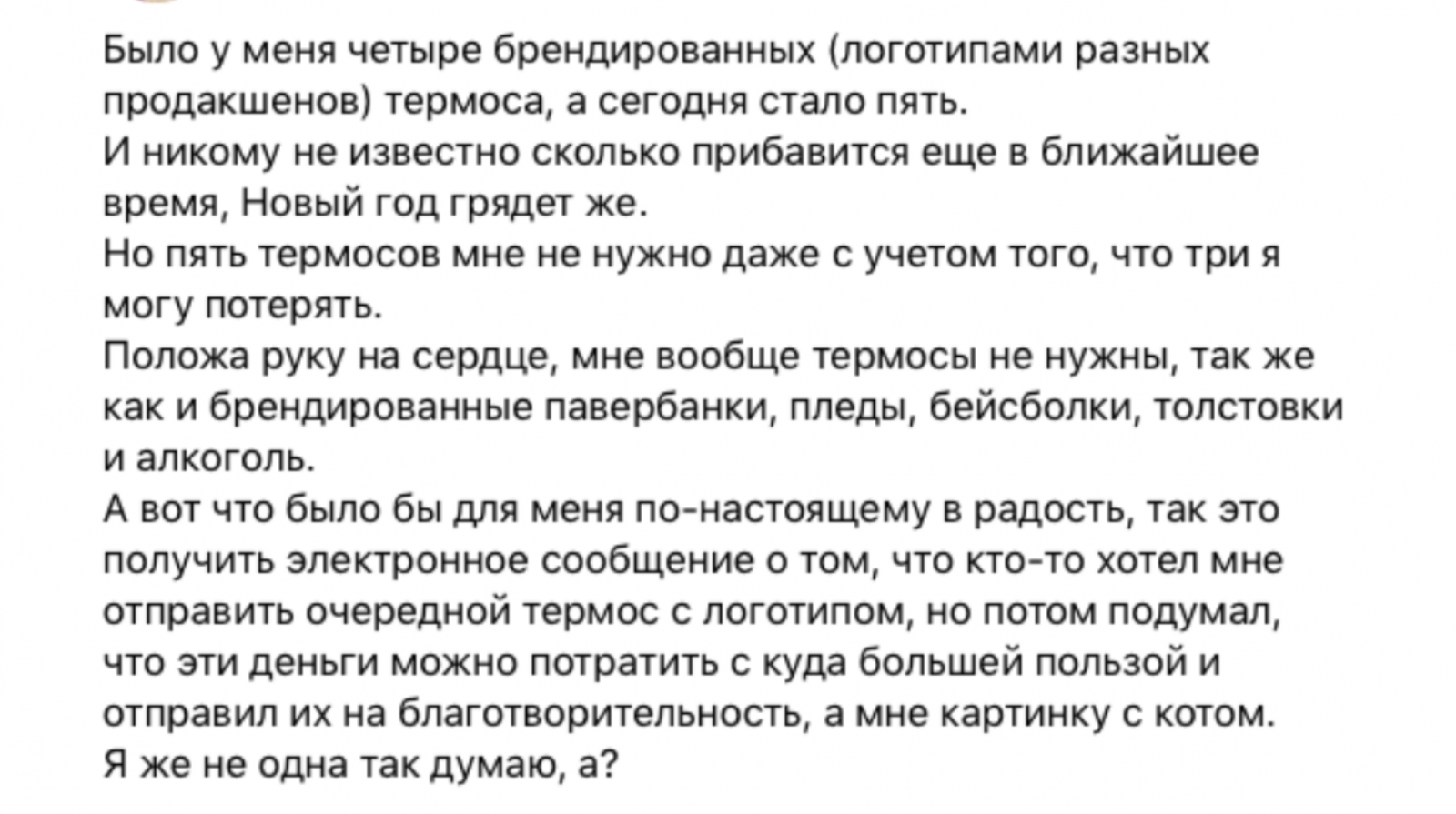 Люся Потапова, продюсер BBDO Group, за две недели до Нового года в своем блоге призывала тратить деньги на благотворительность, а не на однотипные корпоративные подарки, которым часто не находится применение.