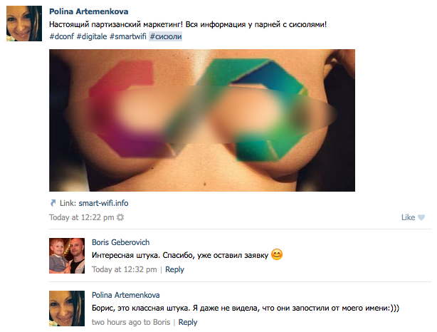 «После подключения у людей на стене появился безобидный баннер с маленькой припиской внизу smart wifi. За 3 минуты до конца первой части у всех подключившихся появился второй баннер на стене с СИСЮЛЯМИ. Таким образом мы собрали базу id данных людей с мероприятия, прорекламмировались у них на стене и сделали вируснячек через хэш теги на большим экране, которые они не смогли заБАНить, так они приходили от всех подключившихся. Для нас ваше НЕТ - ЭТО ВСЕГО ЛИШЬ ОЧЕРЕДНОЙ ВЫЗОВ С ДЕВИЗОМ «КАК»?»