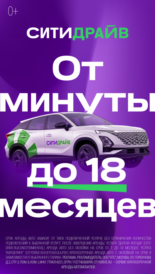 В OLV-размещении «Ситидрайв» рассказывает про «Ситидрайв Рент» — новое направление бизнеса в Санкт-Петербурге с возможностью взять машину напрокат на срок от одного дня.