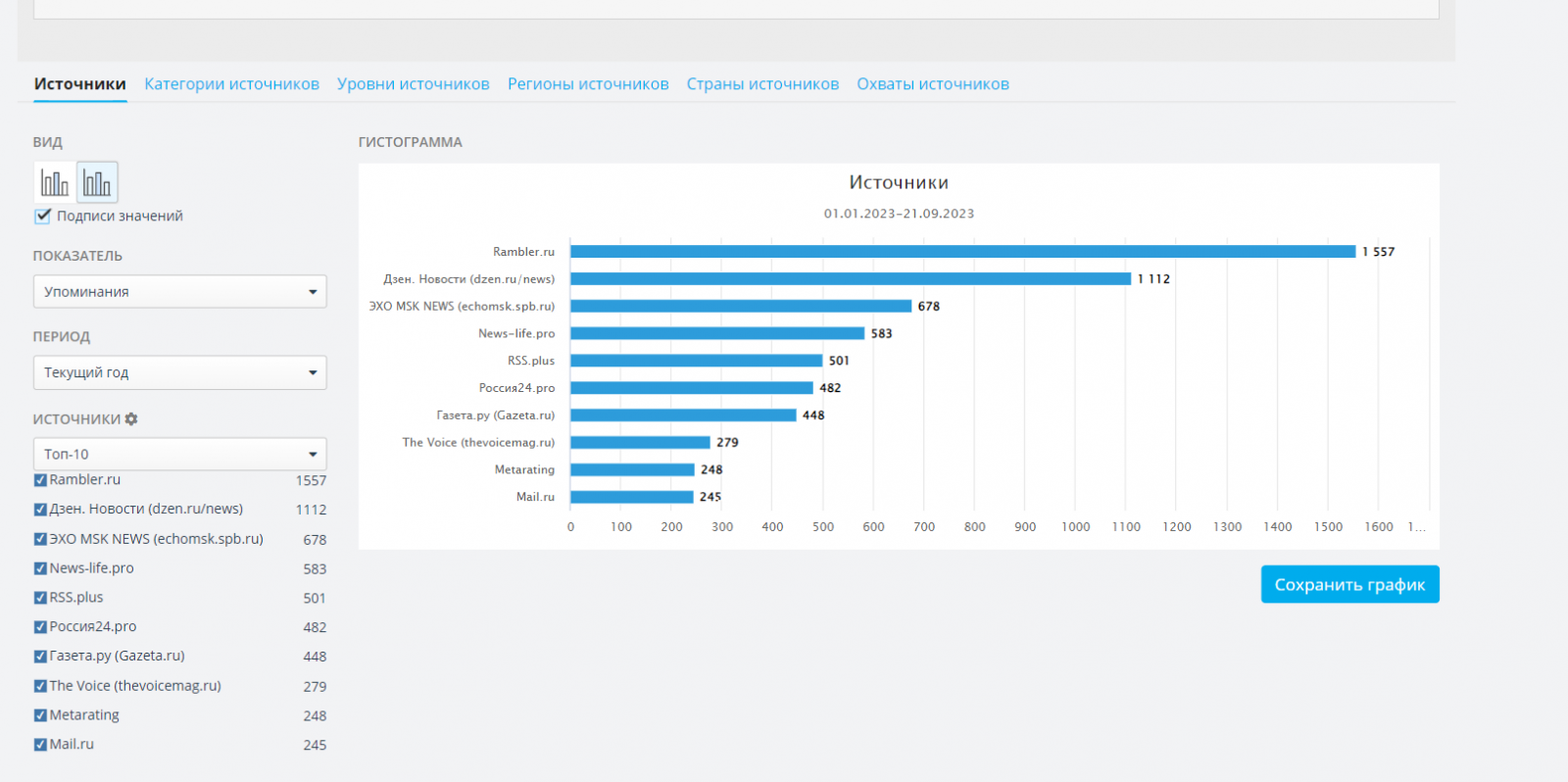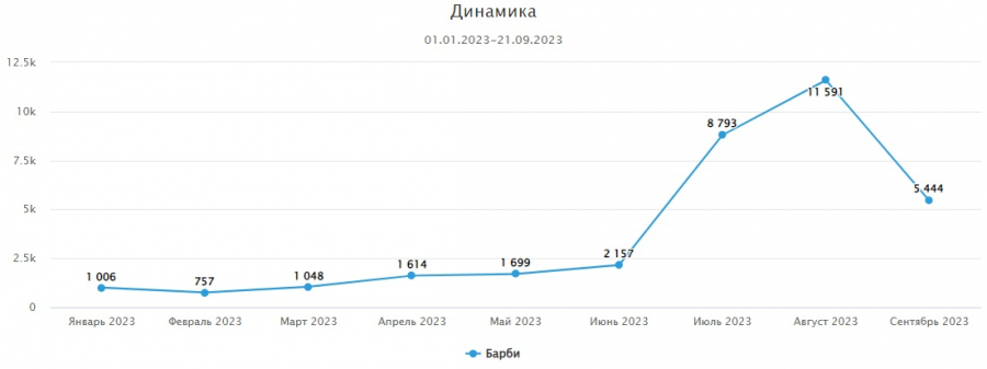 Мы решили проанализировать, как в российских СМИ разошёлся выход картины «Барби». Так, если смотреть на график с динамикой упоминаний «Барби», видно, что пик распространения новостей о фильме пришёлся на август этого лета, как раз после выхода фильма в мировой прокат в июле.