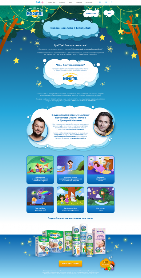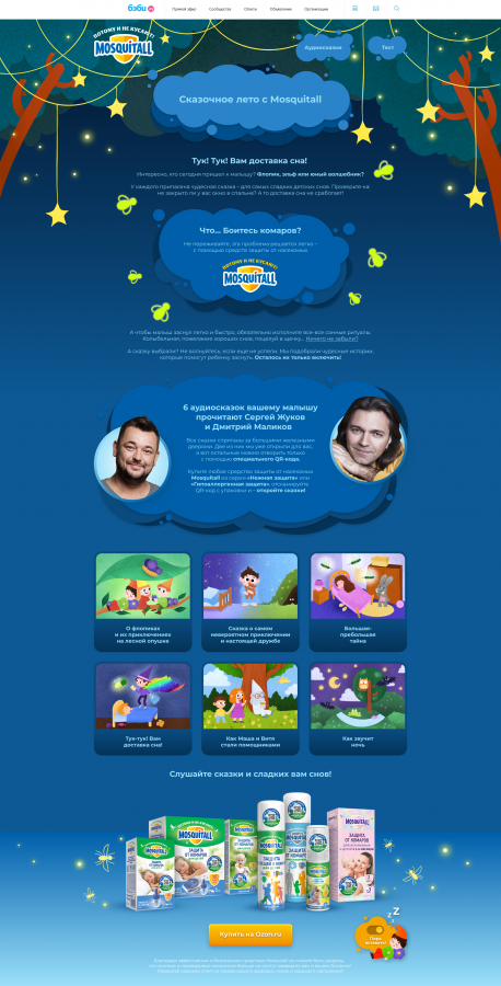 На сервисе для мам baby.ru был запущен спецпроект «Сказки на ночь» из двух частей: аудиосказки для малышей, прочитанные приглашенными звездами, и иллюстрированный тест про ритуалы сна для детей с советами эксперта.