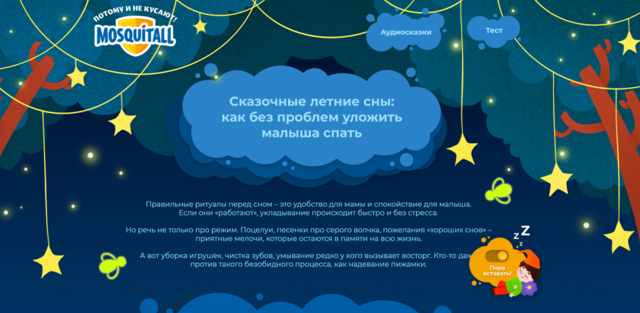 В процессе укладывания детей родители часто сталкиваются с проблемами. Бренд Mosquitall в своем спецпроекте «Сказки на ночь» решил поделиться экспертизой в вопросах сна и защиты детей от надоедливых насекомых. Команда агентства