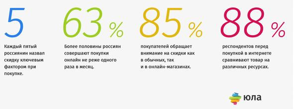 Большинство покупателей (85%) обращает внимание на скидки как в обычных, так и в онлайн-магазинах. А каждый пятый россиянин назвал ее ключевым фактором при покупке, сообщается в совместном исследовании сервиса объявлений «Юла» и проекта Research.Mail.Ru.