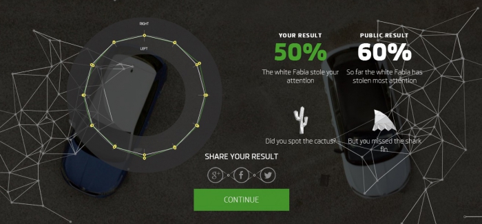 Škoda запустила digital кампанию в поддержку новой Fabia. Агентство 18 Feet & Rising создало интерактивный ролик и сайт Fight for Attention. Пользователю предлагается посмотреть 90-секундное видео, предварительно настроив веб-камеру. В ролике показаны два автомобиля, которые преодолевают различные локации и в конце соединяются в одной точке. Взгляд зрителя отслеживает технология eye-tracking от B-Reel, на ее основе сайт выдает результат — какая машина привлекла больше внимания, а также общую статистику.