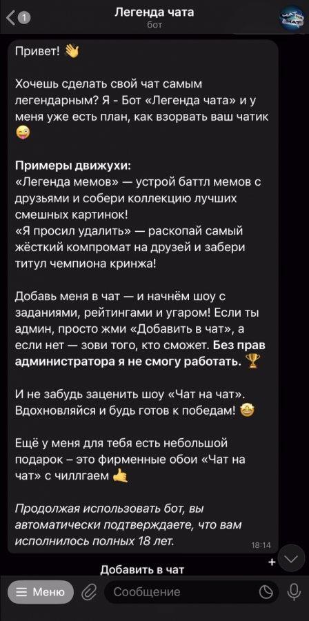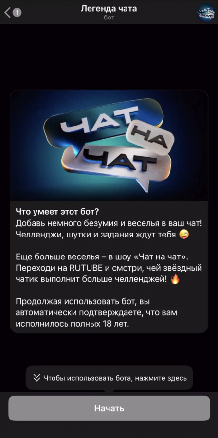 Креативная студия SMIT. разработала развлекательного бота «Легенда чата». Он отправился в диалоги пользователей, чтобы устроить настоящее приключение. Бот предлагал простые челленджи из шоу, делился мемами, выбирал победителей и создавал локальные рейтинги. Новый «друг» оживил чаты участников и подарил им массу веселья под конец года.