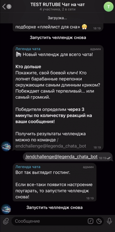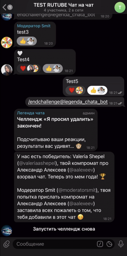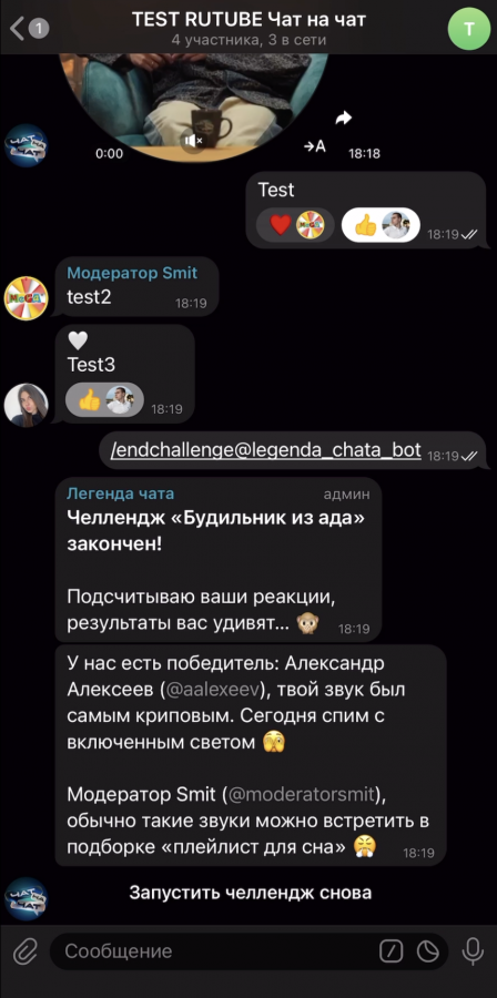 Под Новый год российский видеохостинг RUTUBE перенес формат шоу «Чат на чат» в Telegram. В каждом выпуске два звездных гостя соревнуются друг с другом, но задания выполняют их близкие. Селебрити следят за происходящим и участвуют в состязаниях, используя креативность и находчивость.