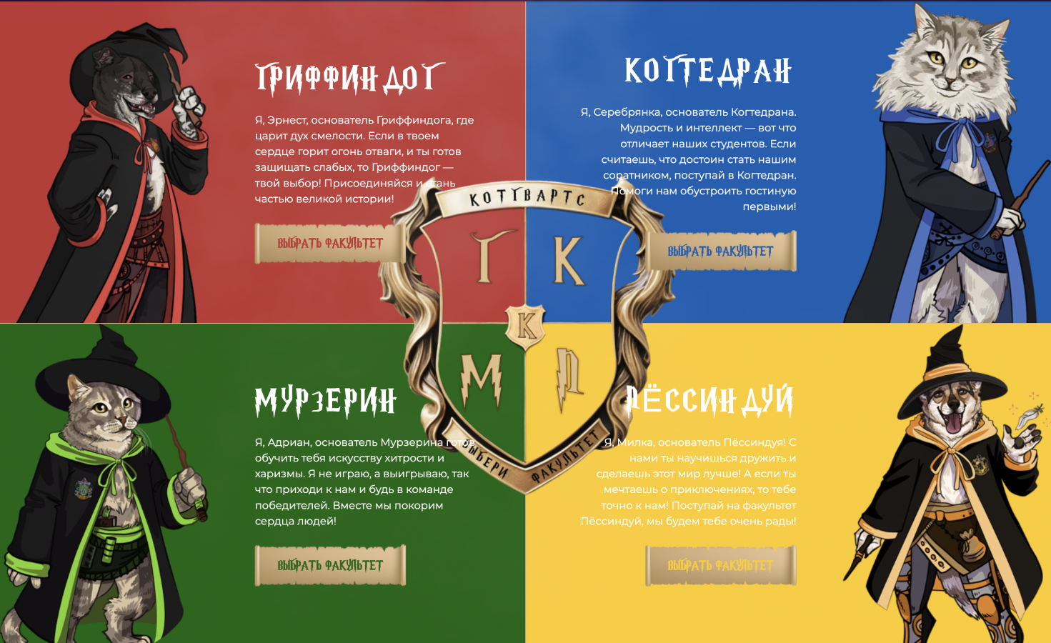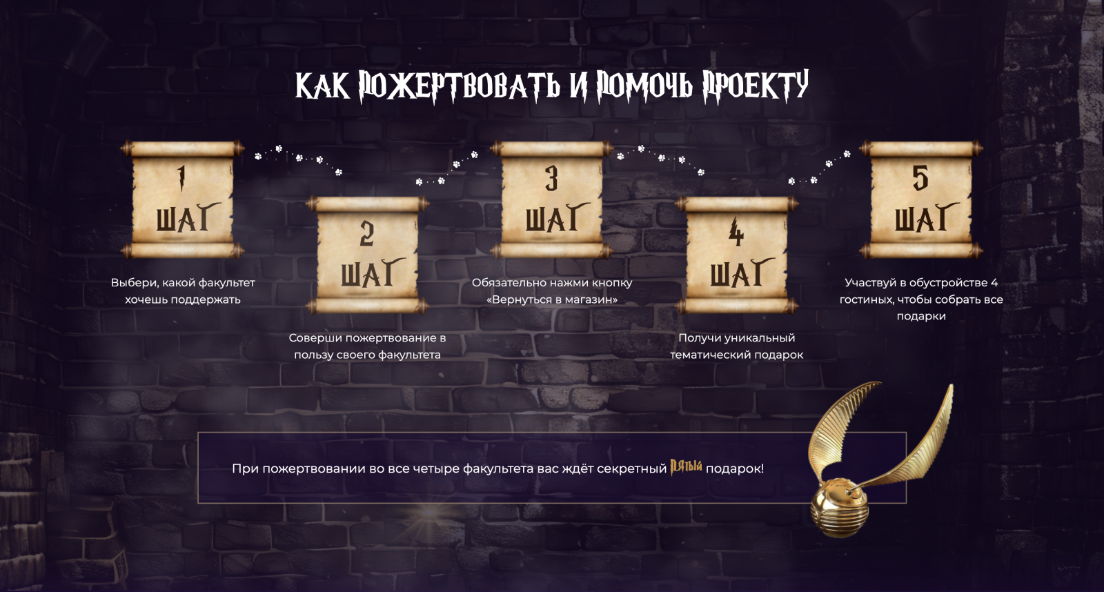 Фонд «Рука помощи бездомным животным» собирает деньги на открытие современного приюта в Пензе. В рамках проекта «Котгвартс» пользователи могут пожертвовать в пользу одного из четырех факультетов: «Гриффиндог», «Пёссиндуй», «Когтедран» и «Мурзерин». За каждым факультетом стоят реальные подопечные и сотрудники фонда. Доноры получают эксклюзивные подарки, а главный суперприз ждет тех, кто поддержит ремонт всех факультетов.