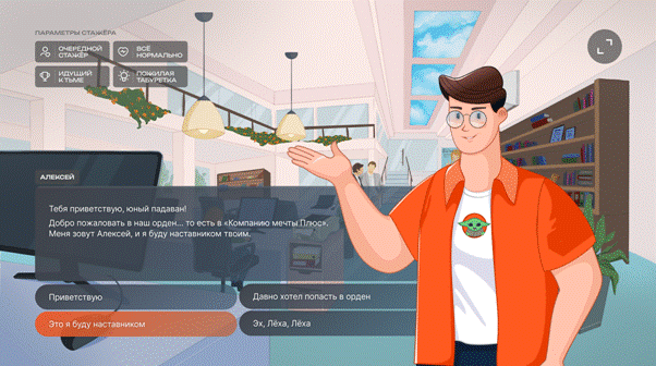 Проект «Профразвитие» запустил визуальную новеллу, которая моделирует первый день стажёра и превращает процесс регистрации в увлекательный квест. Пользователи знакомятся с офисом, осваивают рабочие задачи, проходят мини-игры и получают подборку стажировок на основе своих решений.
