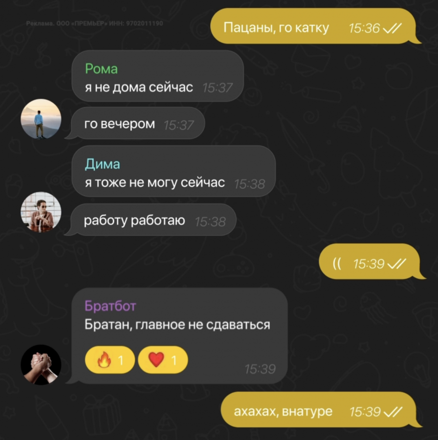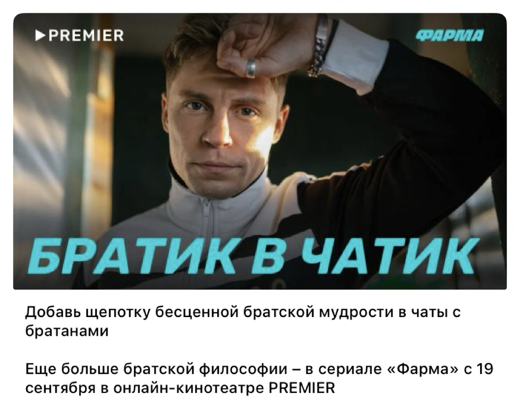 Как рассказать о сериале так, чтобы его обсуждали не в комментариях под рекламой, а в живых диалогах? Для «Фармы» мы придумали чат-ботов, которые сами говорили с аудиторией. В Telegram «Братбот», разработанный креативной студией SMIT., вписался в переписки, отвечая на сообщения в стиле героев сериала и раздавая промокоды на просмотр. Во «ВКонтакте» бот работал как тест — пользователи угадывали «пацанские» цитаты, получали свой «братский статус» и тоже могли забрать промокод. Все механики строились на юморе, вовлечении и вирусности — так сериал стал не просто контентом, а частью повседневного общения.