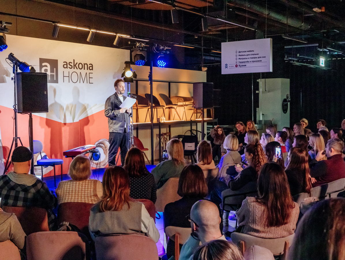 Новый гипермаркет Askona Home открылся в Москве и превратил презентацию в арт-пространство. Гостей ждал вечер «БеспринцЫпных чтений» — Александр Цыпкин и Надежда Михалкова читали добрую прозу в театральной зоне с мягкими креслами и диванами.