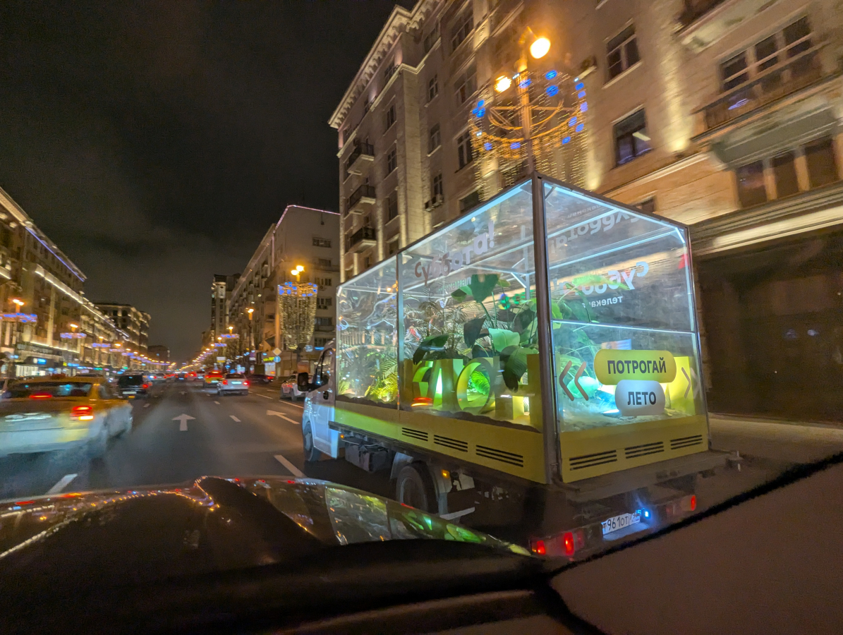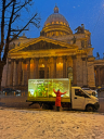 31 января грузовик можно было встретить в Москве — на Тверской и у фудмолла «Депо». В выходные он отправился в Санкт-Петербург, сделав остановки на Дворцовой и Казанской площадях, у Исаакиевского собора и на Невском.
