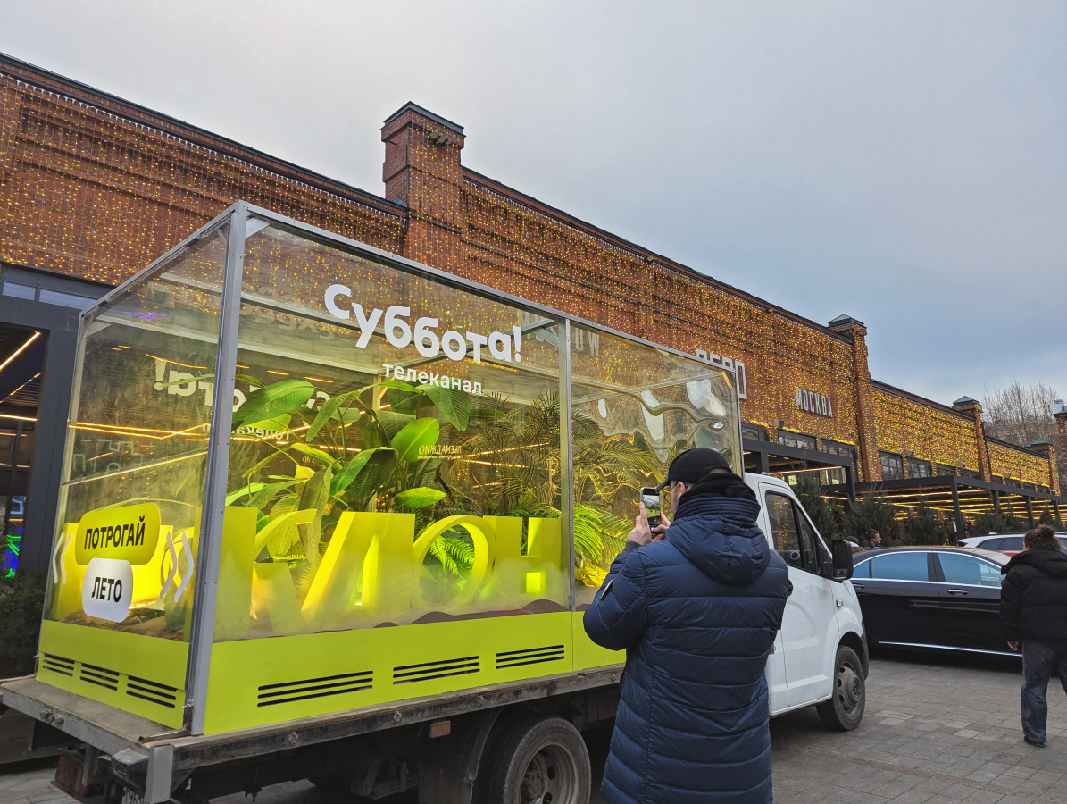 Суббота!» — прозрачный «тёплый» грузовик с пальмами. Он создавал атмосферу восточной сказки прямо среди зимнего города, приглашая прохожих погреться и почувствовать себя в марокканских пейзажах сериала «Клон».