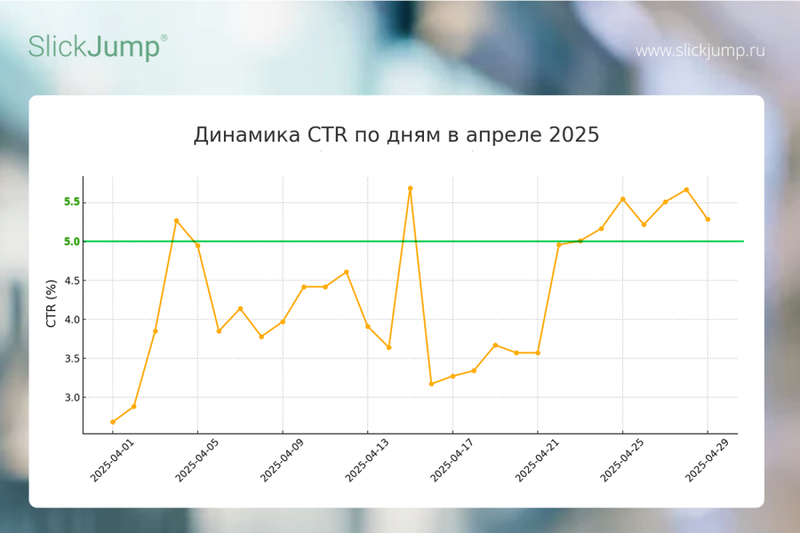 С первых дней размещения наблюдался рост эффективности: с 4 апреля CTR стабильно превышал 4%, а в отдельные дни достигал 5,5% и выше. Рост стал результатом адаптивной настройки алгоритмов под живую реакцию аудитории.
