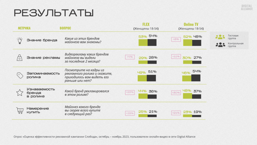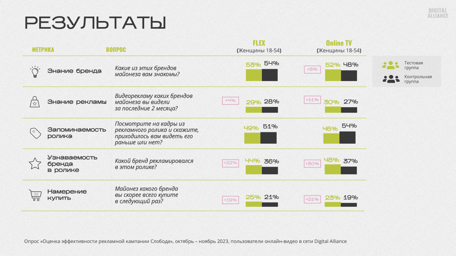 Оказалось, что у пользователей, которые видели ролик в диджитальном рекламном блоке, узнаваемость бренда «Слобода» после контакта с роликом выросла среди всей аудитории: 43% в тестовой группе по сравнению с 33% в контрольной (прирост — более 30%), в целевой аудитории клиента рост аналогичный. При этом рост других бренд-метрик, например знание рекламы бренда, запоминаемость рекламного ролика и намерение купить, не уступает обычной рекламной кампании клиента.