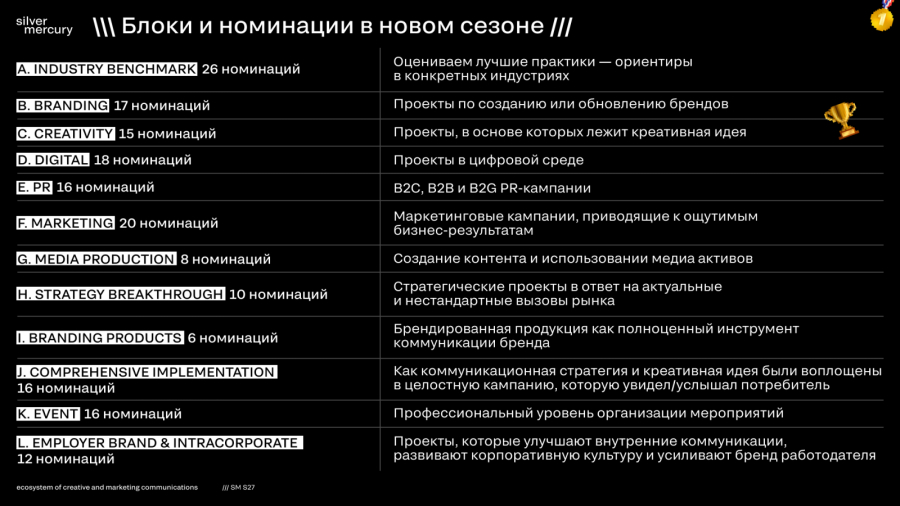 Участников SM 27 ждет обновленная сетка номинаций, которая еще точнее отражает современный ландшафт маркетинговых коммуникаций. Расширенная программа нетворкинга и мероприятий позволит не только заявить о своих проектах, но и обменяться опытом с лучшими профессионалами рынка.