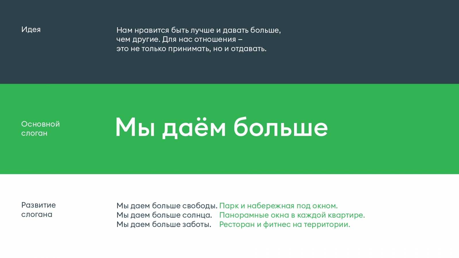 Опираясь на уникальные торговые предложения бренда, агентство разработало креативную идею, выраженную в слогане «Мы даем больше». Креаторы SmartHeart объясняют — столь амбициозная идея была обоснована конкретными преимуществами бренда: от больших панорамных окон и большего количества сервисов до более широких инфраструктурных возможностей.