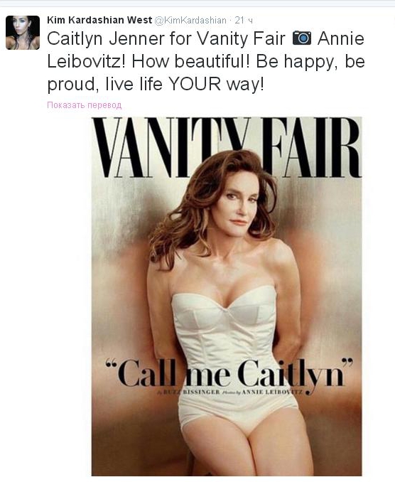 В первом твите опубликован снимок обложки журнала Vanity Fair с фотографией Дженнер. «Я так счастлива после долгих лет борьбы стать настоящей собой. Добро пожаловать в мир Кейтлин».