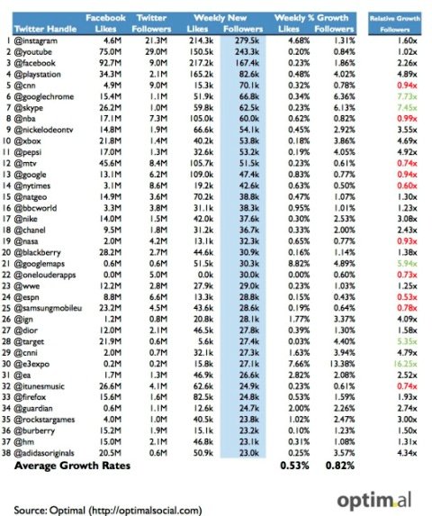 Однако в скором времени место Facebook может занять Twitter. Центр исследований «РИА Новости» приводит данные исследования компании Optimal: в процентном соотношении бренды в Twitter растут на 55% быстрее, чем в Facebook. Например, Twitter-аккаунт фото-сервиса Instagram растет быстрее, чем его аккаунт в Facebook: 279 500 новых подписчиков против 214 300. Общее число подписчиков Instagram в Twitter значительно превышает аналогичный показатель в Facebook: 21,3 млн и всего 4,6 млн.