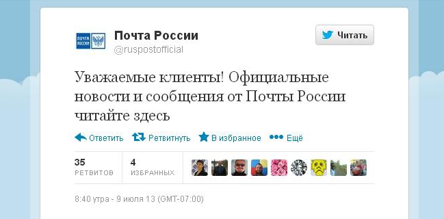 ФГУП «Почта России» сменила аккаунт в Twitter. Компания объявила, что теперь официальные новости и сообщения будут размещаться в микроблоге @ruspostofficial. По информации «Известий», решение не было добровольным: предыдущий аккаунт @postofrussia забрал ее фактический владелец – представитель фирмы, которая занималась SMM для «Почты России».