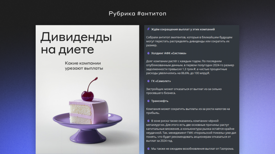 - Антитоп. Решили не показывать, как нужно делать — этого много в других каналах. Вместо этого брали комментарии у аналитика и предостерегали о нежелательных решениях, которые будут обузой для портфеля.