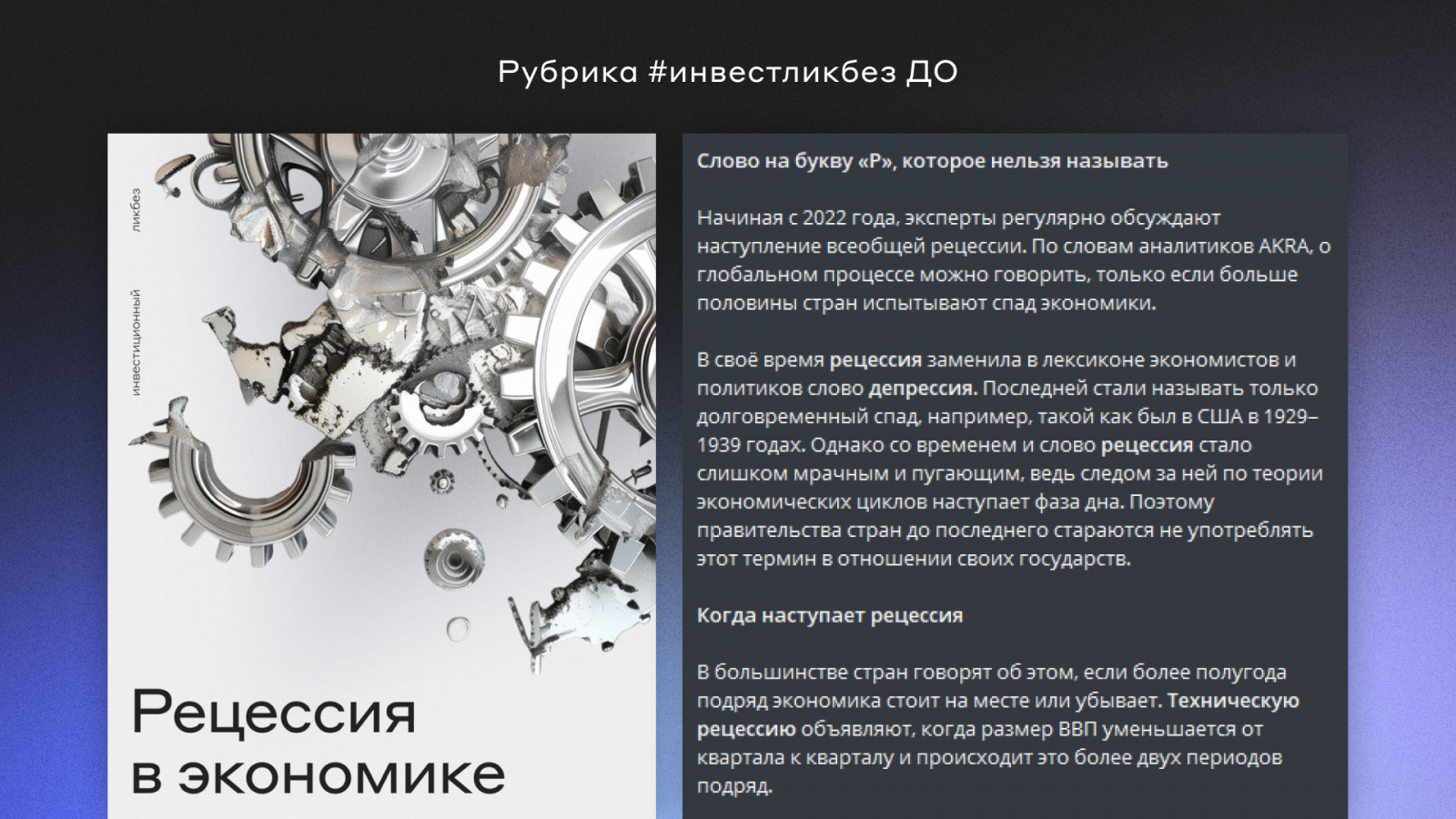 - Инвестликбез. Эту рубрику запустили с начала канала, но скорректировали по ходу работы. Добавили креатив, викторины и стали привязывать посты к актуальным событиям.