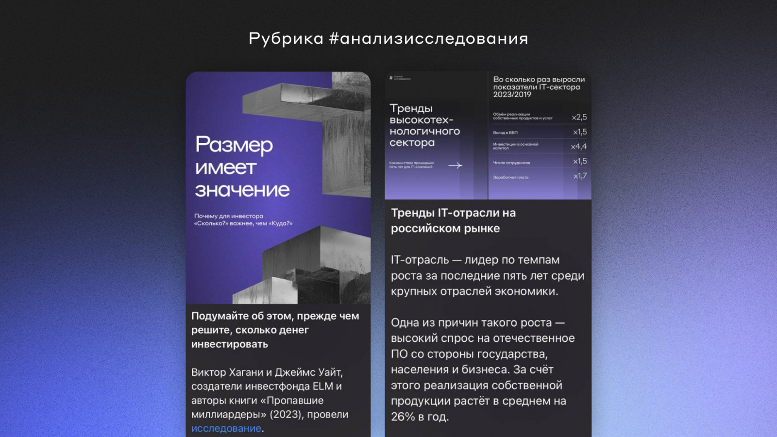 Провели с ними интервью и выяснили круг интересов: долгосрочные инвестиции, аналитика рынка с аргументами и оценкой, погружение в контекст, — и все это в емкой и доступной форме. Они редко комментируют посты, поэтому вместо ставки на вовлеченность мы сосредоточились на качестве контента: сократили тексты, сделали упор на креативные форматы и усилили аналитику.