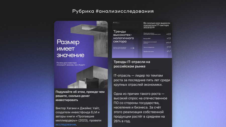 - Аналитика. Разбирали актуальные кейсы и давали экспертную информацию. Знаковым решением было привлечь аналитиков. Оперативные комментарии, актуальные исследования, неочевидные факты — все это дало контенту уникальную экспертизу.