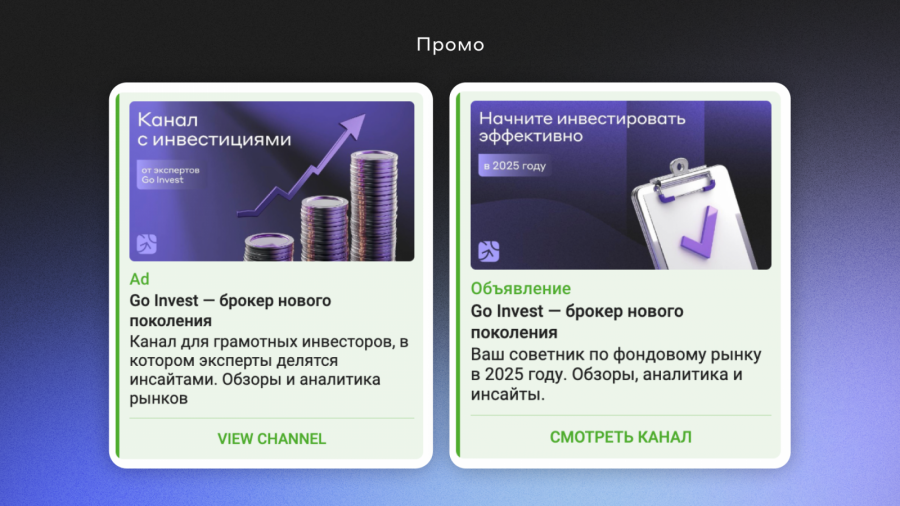 Использовали Telegram Ads. Поначалу тестили, искали свои каналы и пришли к нужной формуле текстовых объявлений: аудитория + польза. Кратко и по делу. Продвигали в блогах экономистов и трейдеров, предпринимателей новой волны, каналах платформ для инвестиций. Ориентировались на строгий TOV.