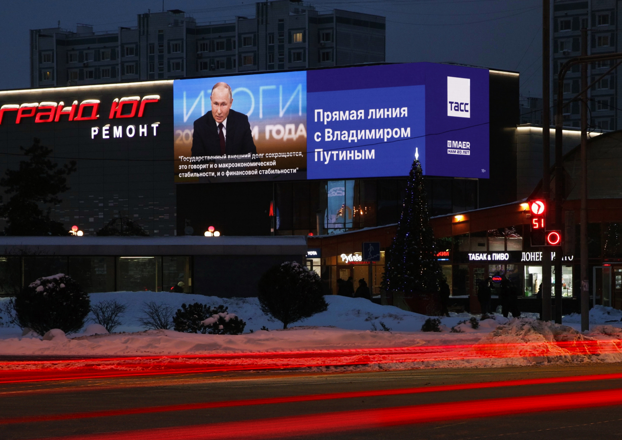 Сильный снегопад и перекрытие дорог 14 декабря привели к высокой загруженности улиц в Москве. Те, кого «Прямая линия» Владимира Путина застала в пробках, смогли увидеть ключевые цитаты президента РФ на больших уличных экранах.