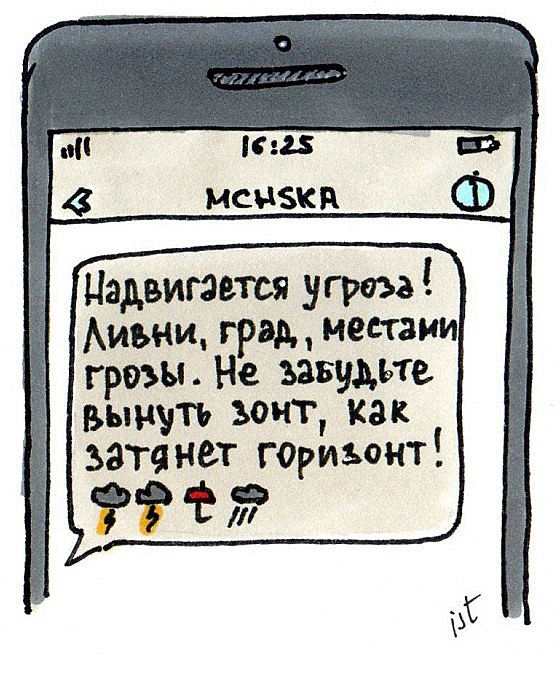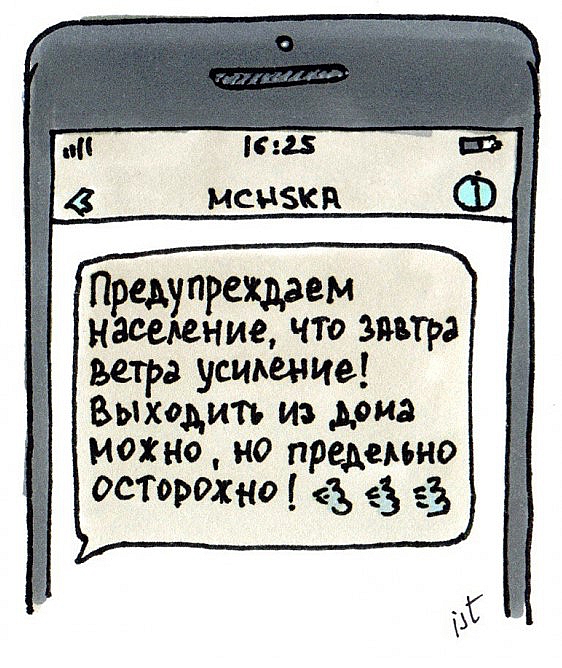 Петербургский художник Илья Тихомиров опубликовал на своей странице «ВКонтакте» цикл рисунков «СМС от МЧС (если в рифму, а не без)», в котором зарифмовал сообщения от министерства и рассказал о плохой погоде в городе, сообщает Sobaka.ru.