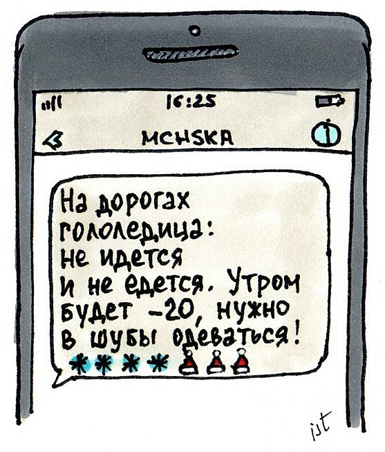 Ко всему нужно относиться с юмором, а к тревожным новостям в особенности. Своими предупреждениями в смс-сообщениях МЧС часто огорчает местных жителей, сообщая о суровых морозах, метелях, обильных осадках.